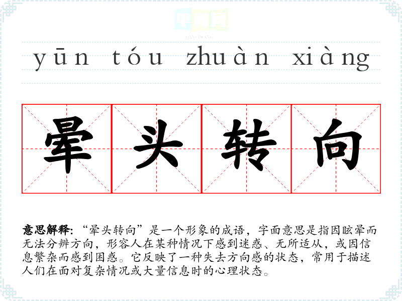 通过对“晕头转向”的学*,我更加理解了在复杂环境中保持清晰思维的重要性。这一成语不仅丰富了我的语言表达,也让我在面对生活中的困惑时,能够更好地调整心态,寻找解决办法。
