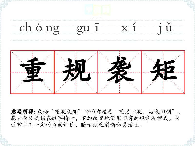 成语“重规袭矩”字面意思是“重复旧规,沿袭旧制”。基本含义是指在做事情时,不加改变地沿用旧有的规章和模式。它通常带有一定的负面评价,暗示缺乏创新和灵活性。