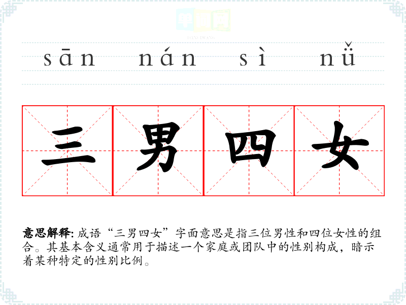 成语“三男四女”字面意思是指三位男性和四位女性的组合。其基本含义通常用于描述一个家庭或团队中的性别构成,暗示着某种特定的性别比例。