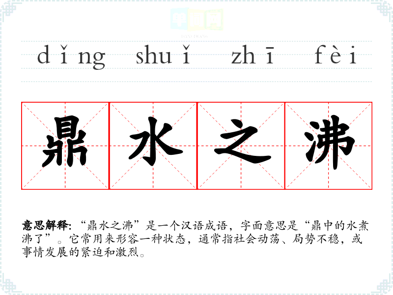 | 鼎水之沸 | 像鼎中的水沸腾一样。形容局势不安定。有时也用以形容人声嘈杂。 |