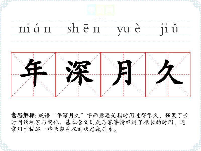成语“年深月久”字面意思是指时间过得很久,强调了长时间的积累与变化。基本含义则是形容事情经过了很长的时间,通常用于描述一些长期存在的状态或关系。
