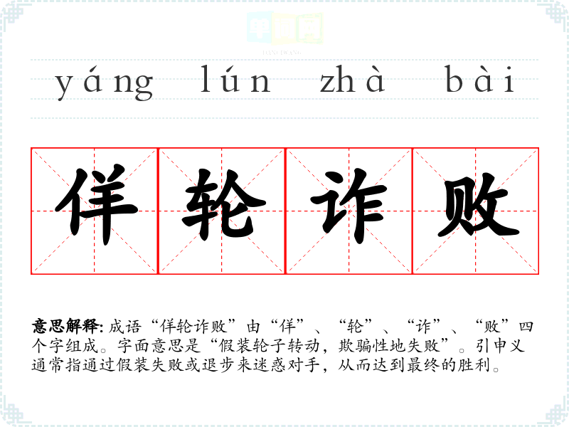 成语“佯轮诈败”由“佯”、“轮”、“诈”、“败”四个字组成。字面意思是“假装**转动,欺骗性地失败”。引申义通常指通过假装失败或退步来迷惑对手,从而达到最终的胜利。