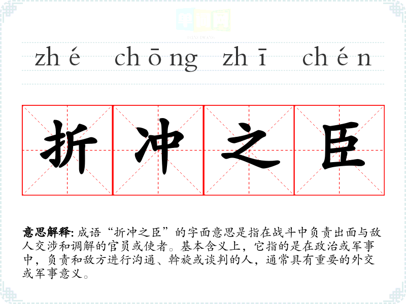 成语“折冲之臣”的字面意思是指在战斗中负责出面与敌人交涉和调解的官员或使者。基本含义上,它指的是在政治或军事中,负责和敌方进行沟通、斡旋或谈判的人,通常具有重要的外交或军事意义。