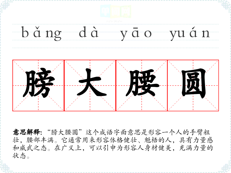 “膀大腰圆”这个成语字面意思是形容一个人的手臂粗壮,腰部丰满。它通常用来形容体格健壮、魁梧的人,具有力量感和威武之态。在广义上,可以引申为形容人身材健美,充满力量的状态。