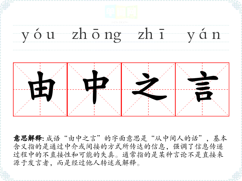 成语“由中之言”的字面意思是“从中间人的话”,基本含义指的是通过中介或间接的方式所传达的信息,强调了信息传递过程中的不直接性和可能的失真。通常指的是某种言论不是直接来源于发言者,而是经过他人转述或解释。