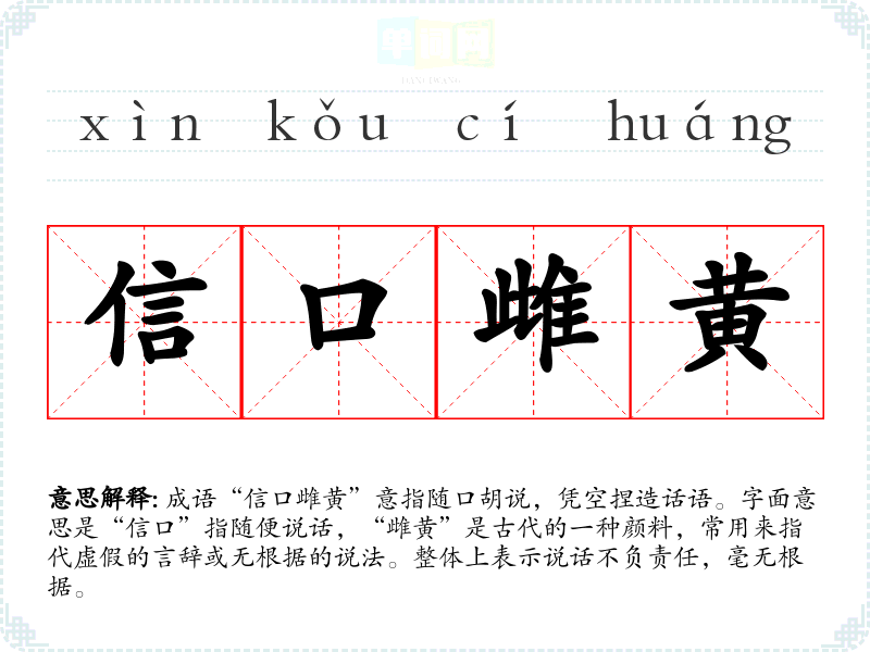 成语“信口雌黄”意指随口胡说,凭空捏造话语。字面意思是“信口”指随便说话,“雌黄”是古代的一种颜料,常用来指代虚假的言辞或无根据的说法。整体上表示说话不负责任,毫无根据。