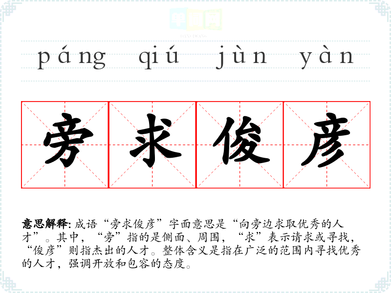 成语“旁求俊彦”字面意思是“向旁边求取优秀的人才”。其中,“旁”指的是侧面、周围,“求”表示请求或寻找,“俊彦”则指杰出的人才。整体含义是指在广泛的范围内寻找优秀的人才,强调开放和包容的态度。