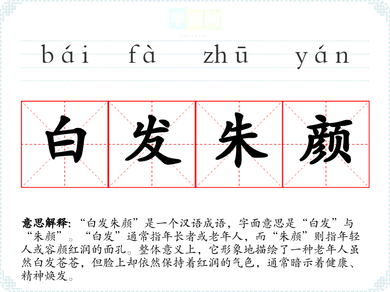 | 白发朱颜 | 颜:脸色。头发斑白,脸色通红。形容老人容光焕发。 |