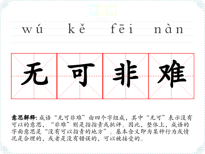 成语“无可非难”由四个字组成,其中“无可”表示没有可以的意思,“非难”则是指指责或批评。因此,整体上,成语的字面意思是“没有可以指责的地方”。基本含义即为某种行为或情况是合理的,或者是没有错误的,可以被接受的。
