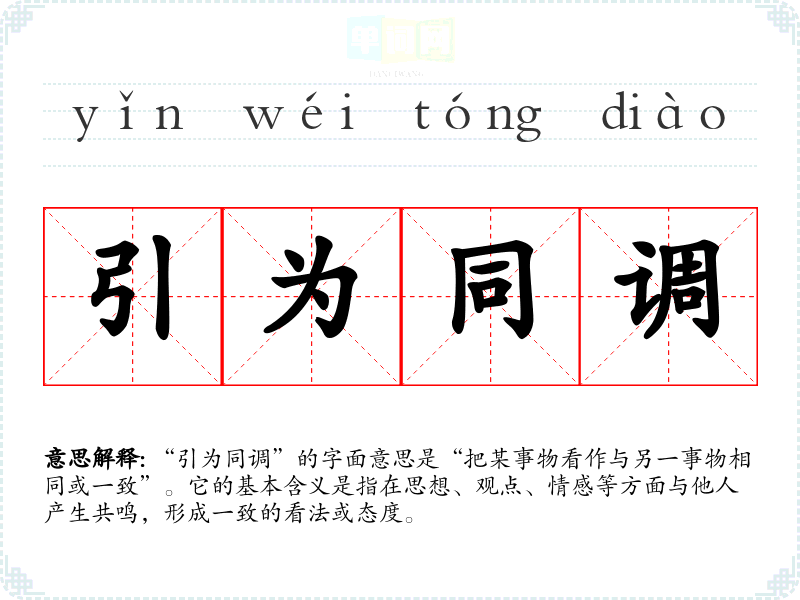 “引为同调”的字面意思是“把某事物看作与另一事物相同或一致”。它的基本含义是指在思想、观点、情感等方面与他人产生共鸣,形成一致的看法或态度。