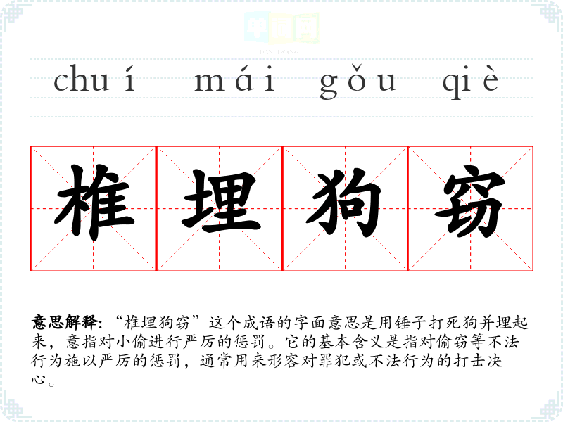 “椎埋狗窃”这个成语的字面意思是用锤子打死狗并埋起来,意指对小偷进行严厉的惩罚。它的基本含义是指对偷窃等不法行为施以严厉的惩罚,通常用来形容对罪犯或不法行为的打击决心。