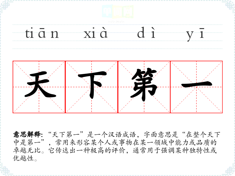 “天下第一”是一个汉语成语,字面意思是“在整个天下中是第一”,常用来形容某个人或事物在某一领域中能力或品质的卓越无比。它传达出一种极高的评价,通常用于强调某种独特性或优越性。