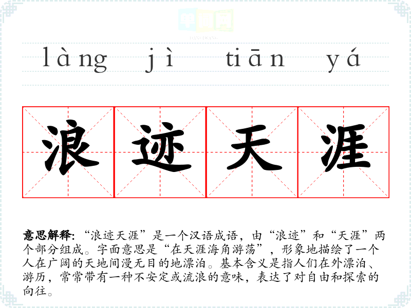 “浪迹天涯”是一个汉语成语,由“浪迹”和“天涯”两个部分组成。字面意思是“在天涯海角游荡”,形象地描绘了一个人在广阔的天地间漫无目的地漂泊。基本含义是指人们在外漂泊、游历,常常带有一种不安定或流浪的意味,表达了对自由和探索的向往。