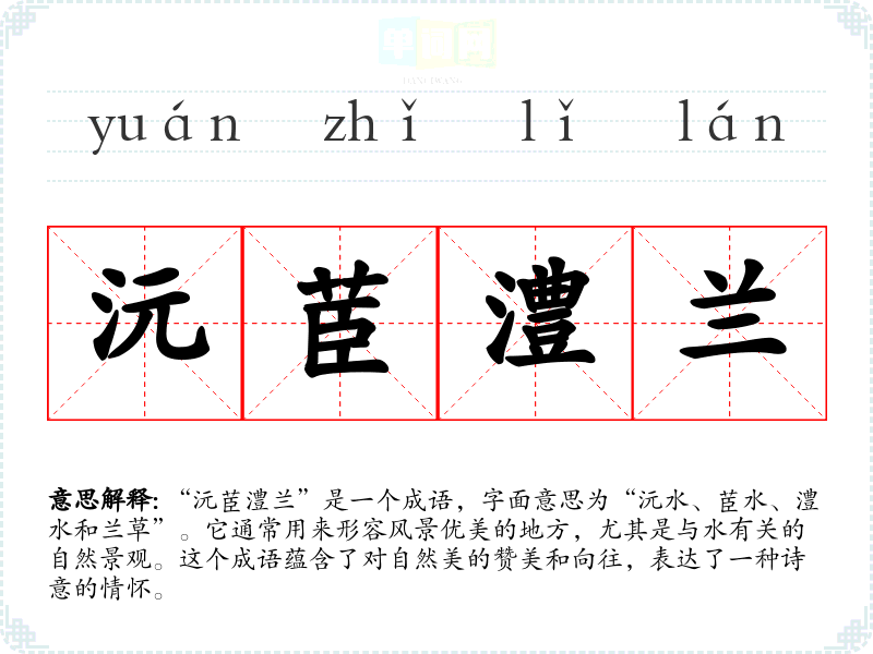 “沅茞澧兰”是一个成语,字面意思为“沅水、茞水、澧水和兰草”。它通常用来形容风景优美的地方,尤其是与水有关的自然景观。这个成语蕴含了对自然美的赞美和向往,表达了一种诗意的情怀。