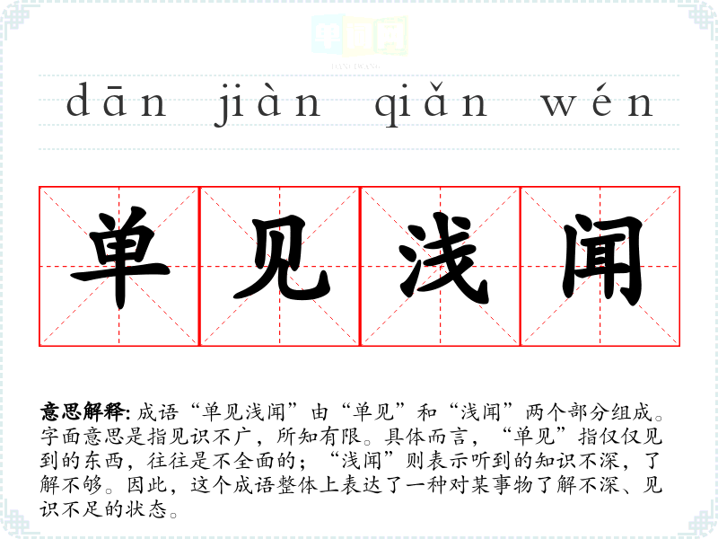 成语“单见浅闻”由“单见”和“浅闻”两个部分组成。字面意思是指见识不广,所知有限。具体而言,“单见”指仅仅见到的东西,往往是不全面的;“浅闻”则表示听到的知识不深,了解不够。因此,这个成语整体上表达了一种对某事物了解不深、见识不足的状态。