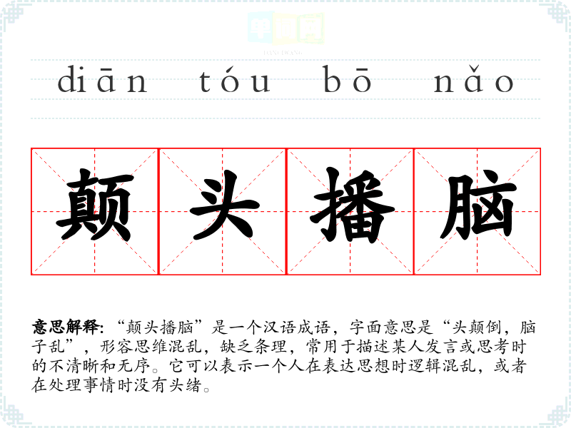 “颠头播脑”是一个汉语成语,字面意思是“头颠倒,脑子乱”,形容思维混乱,缺乏条理,常用于描述某人发言或思考时的不清晰和无序。它可以表示一个人在表达思想时逻辑混乱,或者在处理事情时没有头绪。