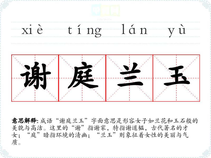 成语“谢庭兰玉”字面意思是形容女子如兰花和玉石般的美貌与高洁。这里的“谢”指谢家,特指谢道韫,古代著名的才女;“庭”暗指环境的清幽;“兰玉”则象征着女性的美丽与气质。