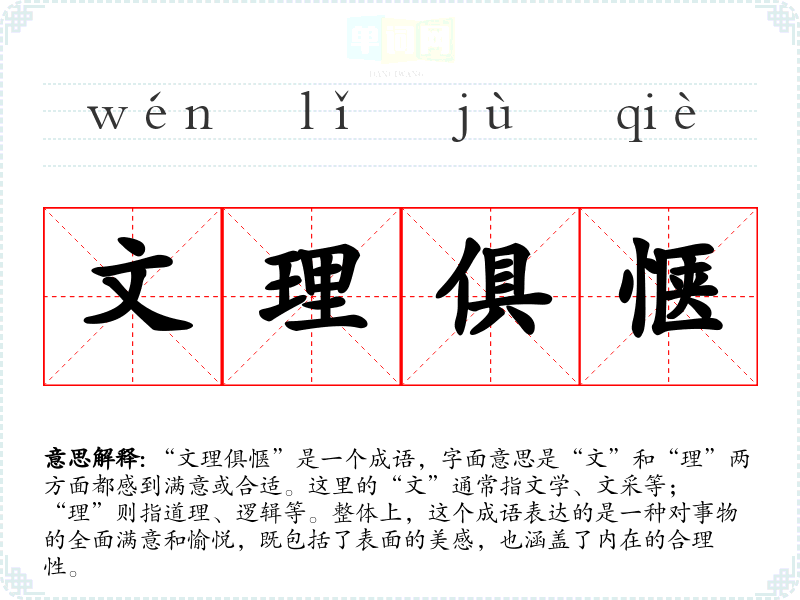 “文理俱惬”是一个成语,字面意思是“文”和“理”两方面都感到满意或合适。这里的“文”通常指文学、文采等;“理”则指道理、逻辑等。整体上,这个成语表达的是一种对事物的全面满意和愉悦,既包括了表面的美感,也涵盖了内在的合理性。