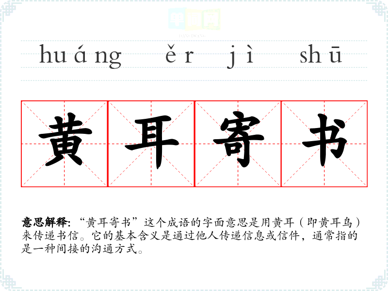 “黄耳寄书”这个成语的字面意思是用黄耳(即黄耳鸟)来传递书信。它的基本含义是通过他人传递信息或信件,通常指的是一种间接的沟通方式。