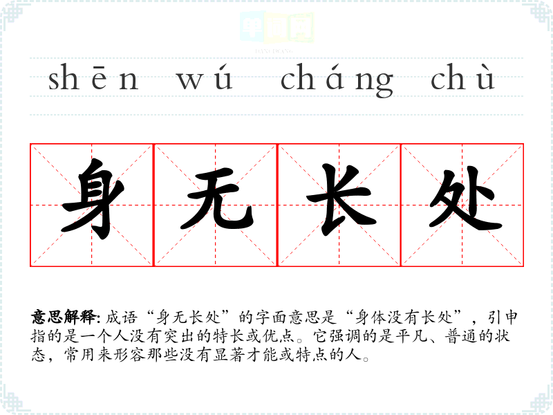 成语“身无长处”的字面意思是“身体没有长处”,引申指的是一个人没有突出的特长或优点。它强调的是平凡、普通的状态,常用来形容那些没有显著才能或特点的人。