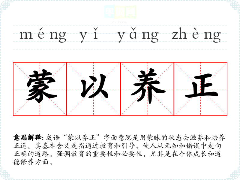 成语“蒙以养正”字面意思是用蒙昧的状态去滋养和培养正道。其基本含义是指通过教育和引导,使人从无知和错误中走向正确的道路。强调教育的重要性和必要性,尤其是在个体成长和道德修养方面。