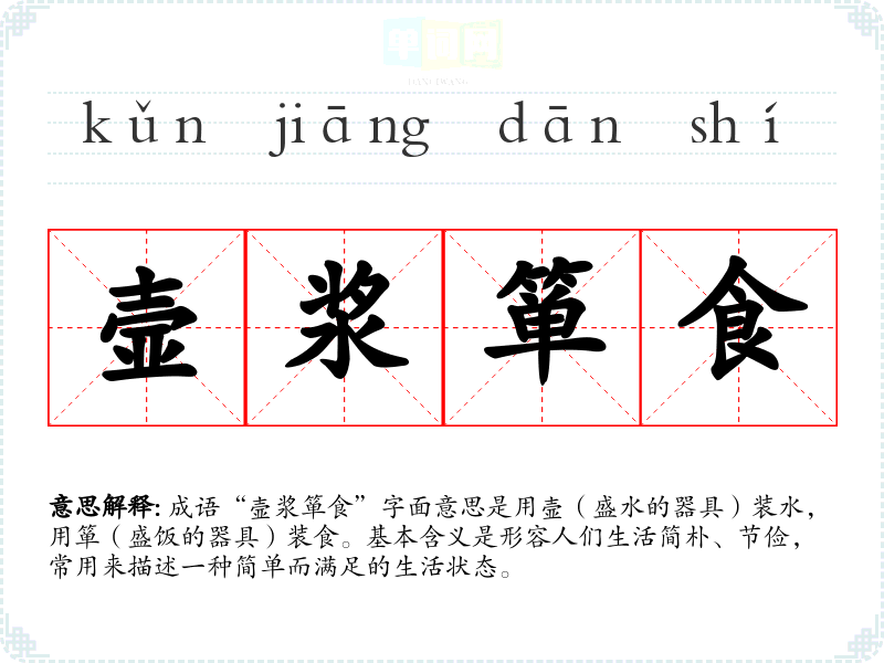 成语“壸浆箪食”字面意思是用壸(盛水的器具)装水,用箪(盛饭的器具)装食。基本含义是形容人们生活简朴、节俭,常用来描述一种简单而满足的生活状态。