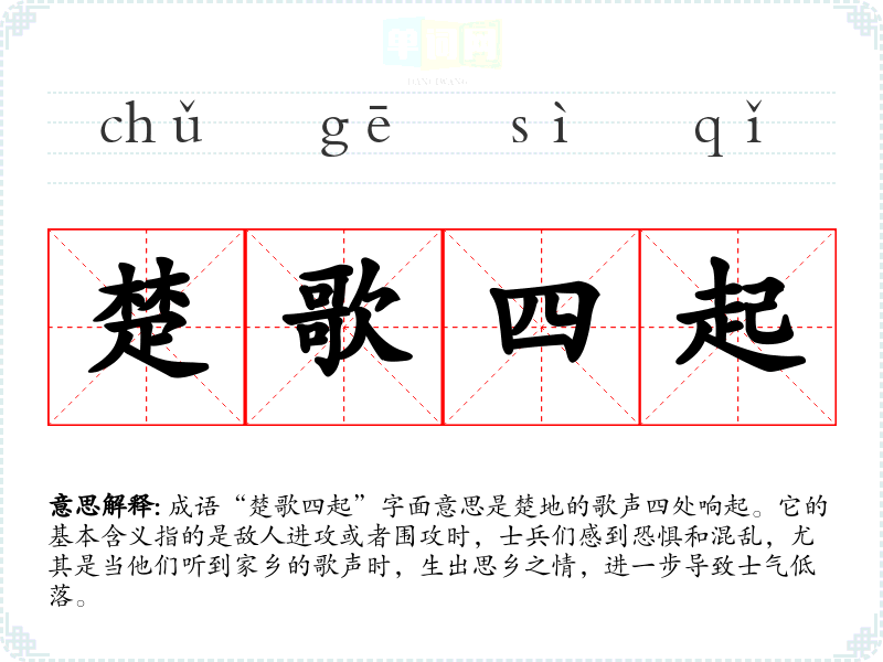 成语“楚歌四起”字面意思是楚地的歌声四处响起。它的基本含义指的是敌人进攻或者围攻时,士兵们感到恐惧和混乱,尤其是当他们听到家乡的歌声时,生出思乡之情,进一步导致士气低落。