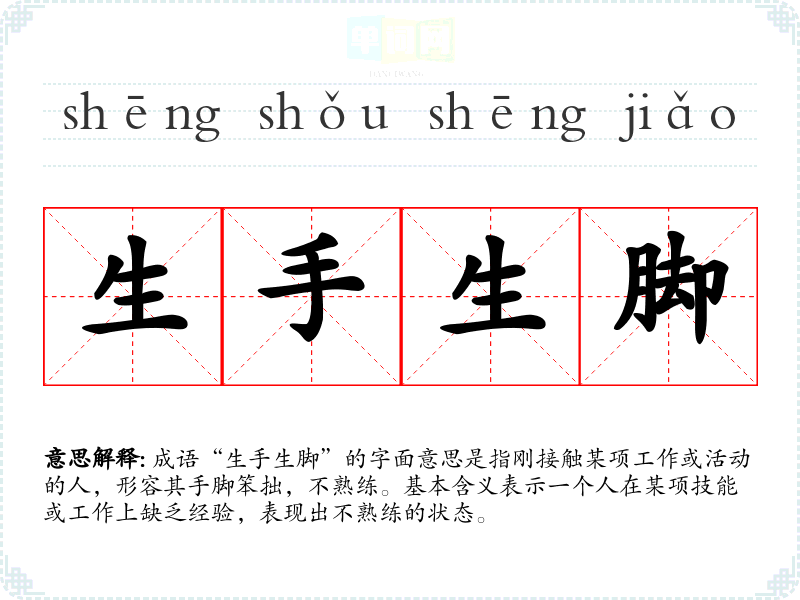 成语“生手生脚”的字面意思是指刚接触某项工作或活动的人,形容其手脚笨拙,不熟练。基本含义表示一个人在某项技能或工作上缺乏经验,表现出不熟练的状态。