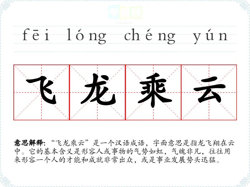 “飞龙乘云”是一个汉语成语,字面意思是指龙飞翔在云中。它的基本含义是形容人或事物的气势如虹,气魄非凡,往往用来形容一个人的才能和成就非常出众,或是事业发展势头迅猛。
