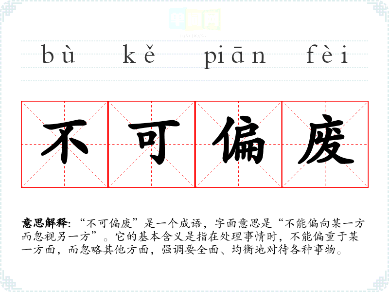 “不可偏废”是一个成语,字面意思是“不能偏向某一方而忽视另一方”。它的基本含义是指在处理事情时,不能偏重于某一方面,而忽略其他方面,强调要全面、均衡地对待各种事物。