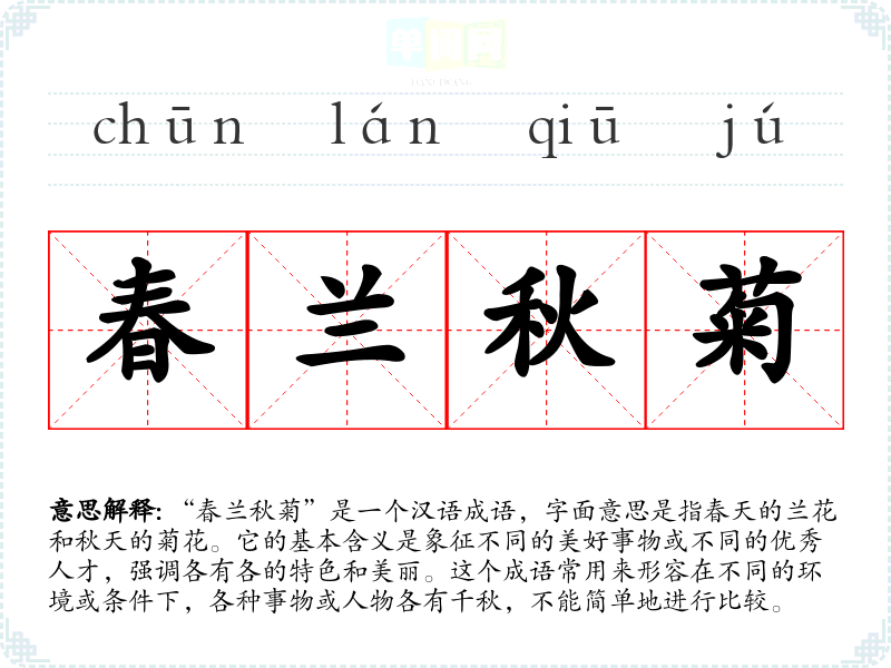 “春兰秋菊”是一个汉语成语,字面意思是指春天的兰花和秋天的菊花。它的基本含义是象征不同的美好事物或不同的优秀人才,强调各有各的特色和美丽。这个成语常用来形容在不同的环境或条件下,各种事物或人物各有千秋,不能简单地进行比较。