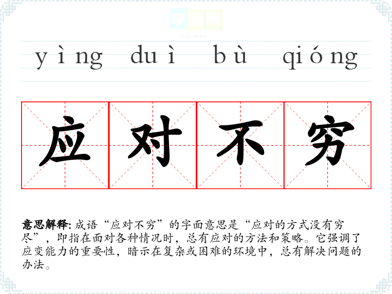 成语“应对不穷”的字面意思是“应对的方式没有穷尽”,即指在面对各种情况时,总有应对的方法和策略。它强调了应变能力的重要性,暗示在复杂或困难的环境中,总有解决问题的办法。