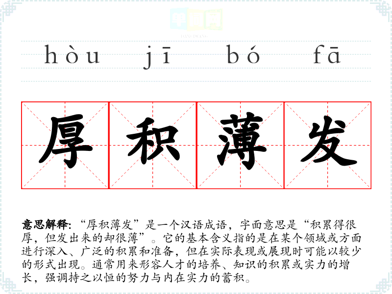 “厚积发”源自于《老子》中的“有之以为利,无之以为用”,意在强调内在的积累和外在的表现之间的关系。成语的具体出现在近现代的文学作品中,逐渐被广泛使用,成为一种鼓励人们在学和工作中注重内涵和实质的表达。