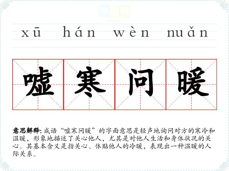 成语“嘘寒问暖”的字面意思是轻声地询问对方的寒冷和温暖,形象地描述了关心他人,尤其是对他人生活和身体状况的关心。其基本含义是指关心、体贴他人的冷暖,表现出一种温暖的人际关系。