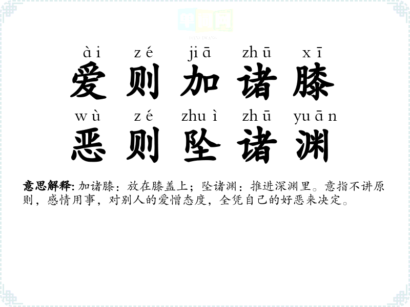 | 爱则加诸膝,恶则坠诸渊 | 加诸膝:放在膝盖上;坠诸渊:推进深渊里。意指不讲原则,感情用事,对别人的爱憎态度,全凭自己的好恶来决定。 |