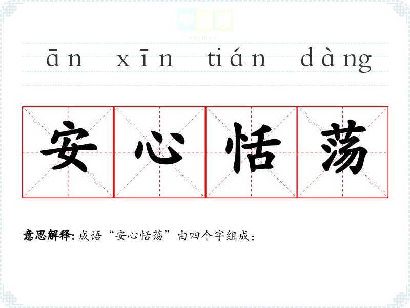 “安心恬荡”并没有明确的历史典故或文学出处,但其构成的字词在古典文学中频繁出现,常用来形容一种理想的内心状态。类似的表达在古代诗词中常被用来描绘隐士的生活或是心灵的宁静。