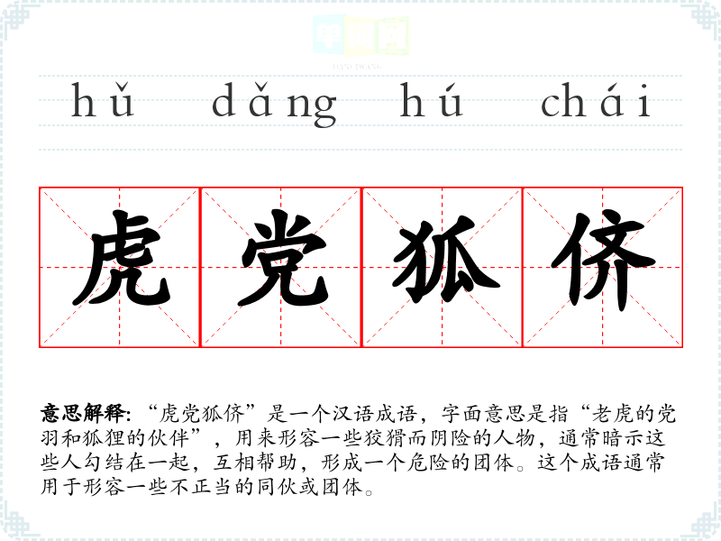 | 虎党狐侪 | 比喻凶恶狡黠之辈。 |
