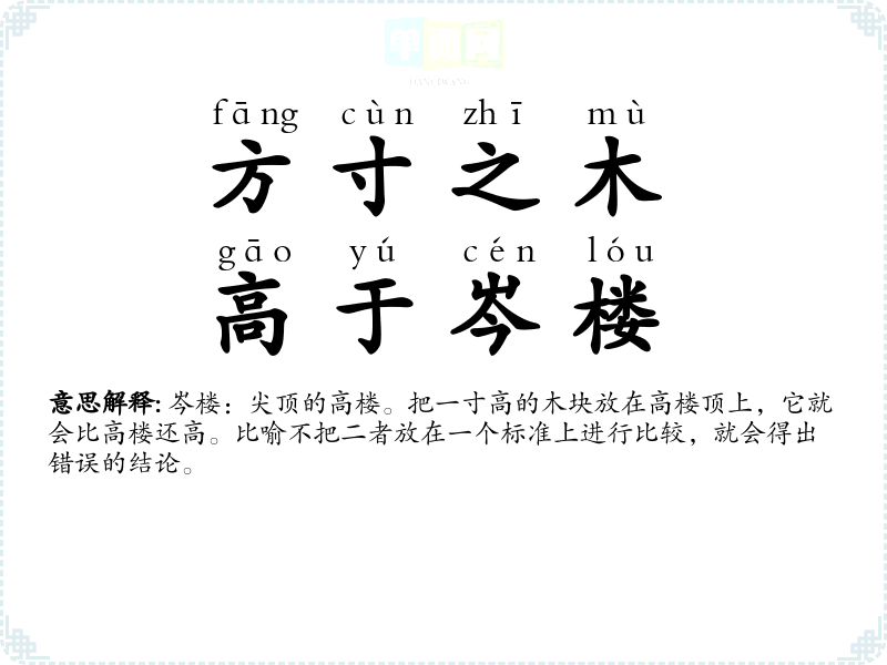 | 方寸之木,高于岑楼 | 岑楼:尖顶的高楼。把一寸高的木块放在高楼顶上,它就会比高楼还高。比喻不把二者放在一个标准上进行比较,就会得出错误的结论。 |