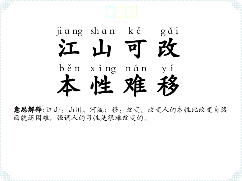 | 江山可改,本性难移 | 江山:山川,河流;移:改变。改变人的本性比改变自然面貌还困难。强调人的习性是很难改变的。 |