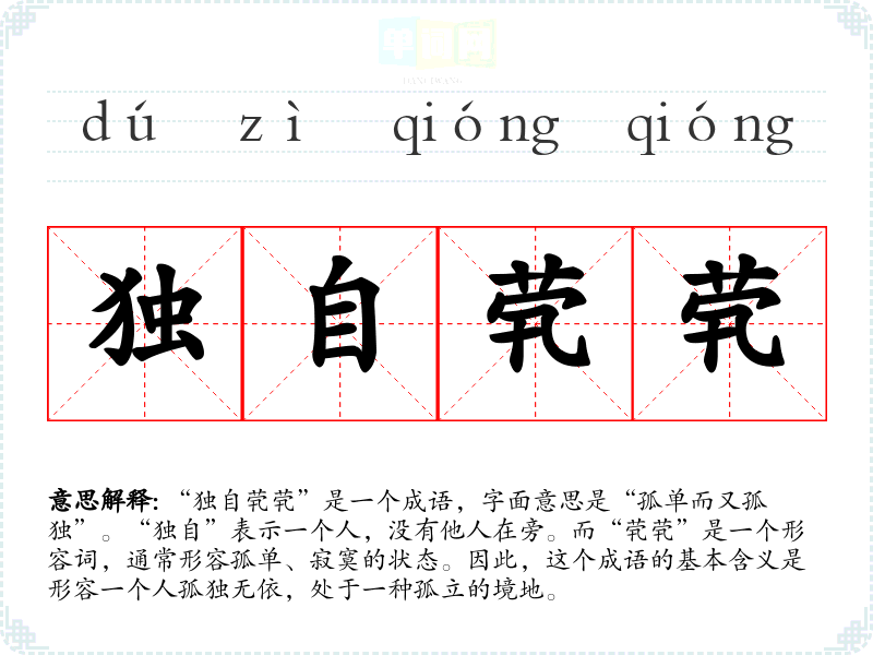 “独自茕茕”是一个成语,字面意思是“孤单而又孤独”。“独自”表示一个人,没有他人在旁。而“茕茕”是一个形容词,通常形容孤单、寂寞的状态。因此,这个成语的基本含义是形容一个人孤独无依,处于一种孤立的境地。