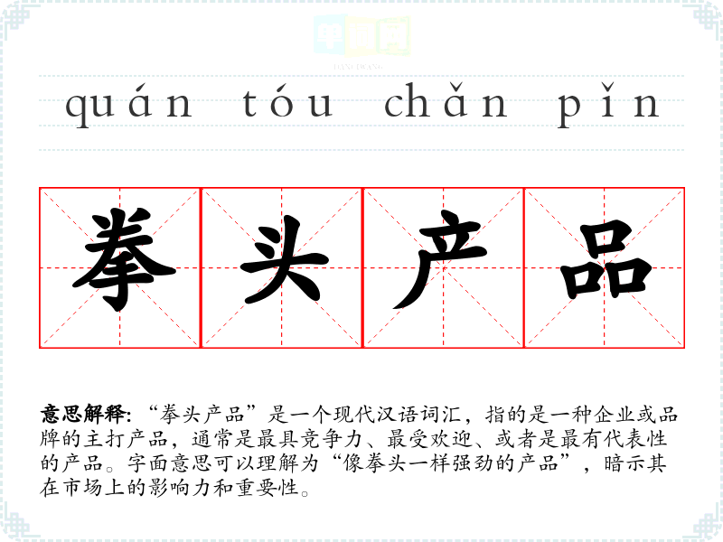 “拳头产品”是一个现代汉语词汇,指的是一种企业或品牌的主打产品,通常是最具竞争力、最受欢迎、或者是最有代表性的产品。字面意思可以理解为“像拳头一样强劲的产品”,暗示其在市场上的影响力和重要性。