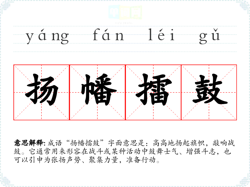 成语“扬幡擂鼓”字面意思是:高高地扬起旗帜,敲响战鼓。它通常用来形容在战斗或某种活动中鼓舞士气、增强斗志,也可以引申为张扬声势、聚集力量,准备行动。