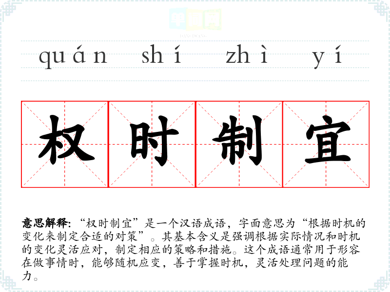 “权时制宜”是一个汉语成语,字面意思为“根据时机的变化来制定合适的对策”。其基本含义是强调根据实际情况和时机的变化灵活应对,制定相应的策略和措施。这个成语通常用于形容在做事情时,能够随机应变,善于掌握时机,灵活处理问题的能力。
