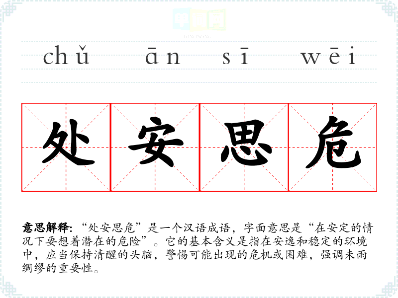 “处安思危”是一个汉语成语,字面意思是“在安定的情况下要想着潜在的危险”。它的基本含义是指在安逸和稳定的环境中,应当保持清醒的头脑,警惕可能出现的危机或困难,强调未雨绸缪的重要性。