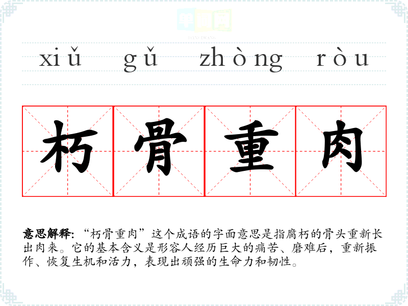 “朽骨重肉”这个成语的字面意思是指腐朽的骨头重新长出肉来。它的基本含义是形容人经历巨大的痛苦、磨难后,重新振作、恢复生机和活力,表现出顽强的生命力和韧性。