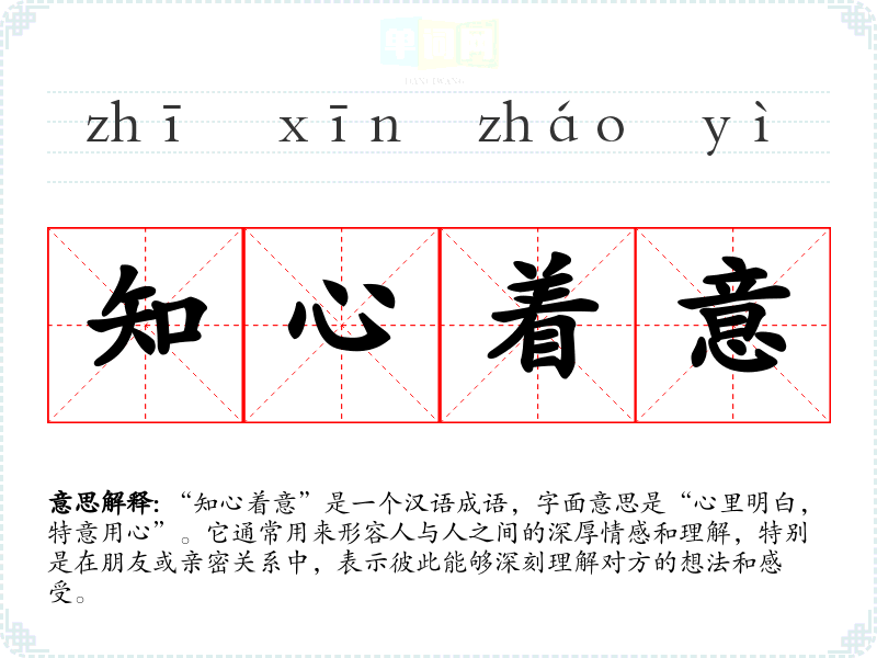 “知心着意”是一个汉语成语,字面意思是“心里明白,特意用心”。它通常用来形容人与人之间的深厚情感和理解,特别是在朋友或亲密关系中,表示彼此能够深刻理解对方的想法和感受。