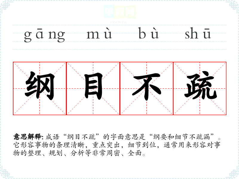 成语“纲目不疏”的字面意思是“纲要和细节不疏漏”。它形容事物的条理清晰,重点突出,细节到位,通常用来形容对事物的整理、规划、分析等非常周密、全面。