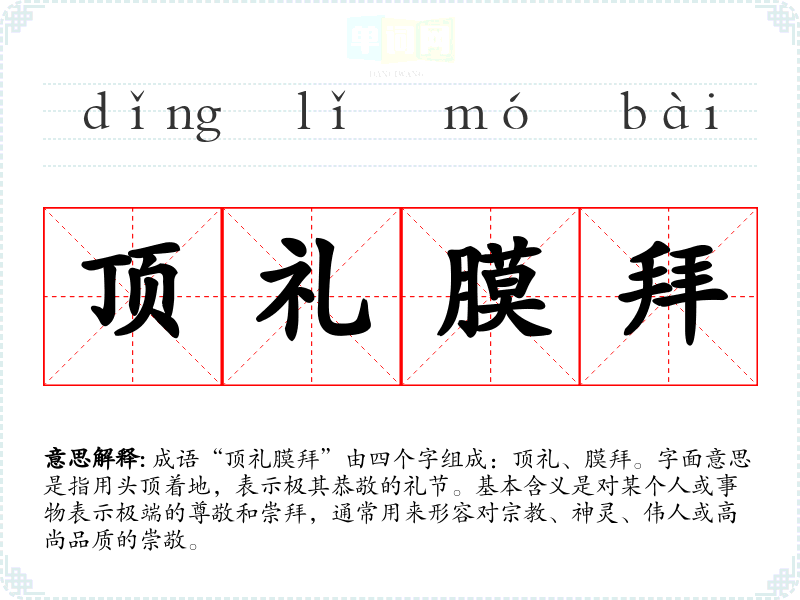- 日常对话:在谈论某位伟人或偶像时,可以用“顶礼膜拜”来表达个人的崇拜之情。