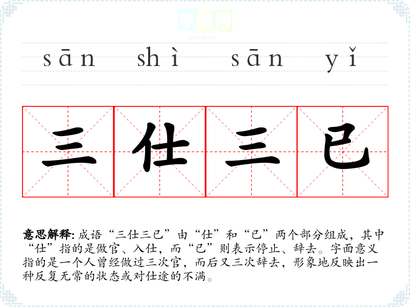 成语“三仕三已”由“仕”和“已”两个部分组成,其中“仕”指的是做官、入仕,而“已”则表示停止、辞去。字面意义指的是一个人曾经做过三次官,而后又三次辞去,形象地反映出一种反复无常的状态或对仕途的不满。