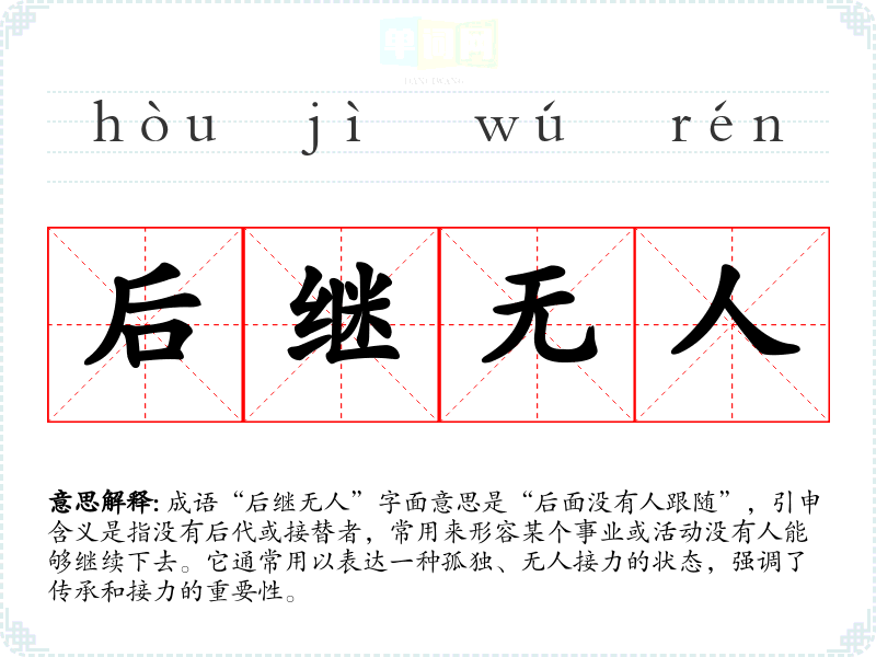 “后继无人”并没有明确的历史典故,但它的构成来源于古代对传承和继承的重视。在古代社会,家族的延续和事业的传承是非常重要的,因此“无人继承”的状态被视为一种悲哀或失败的表现。